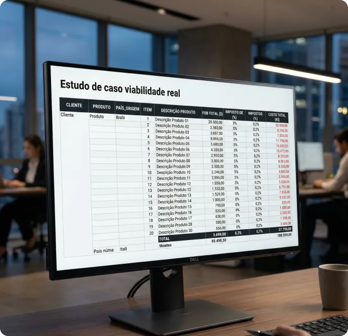 Com o nosso Estudo de Viabilidade Real, você saberá exatamente quanto o produto custa na porta da sua empresa, antes de comprometer qualquer capital.